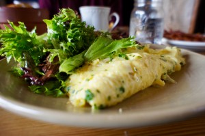 Omelette with gruyere, leeks, potatoes and greens with a side of bacon
